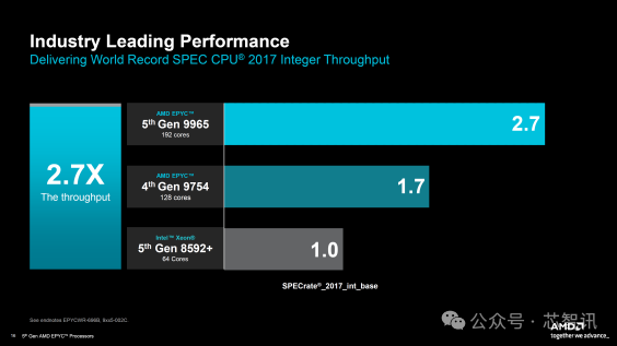 现在让我们谈谈性能,在整个幻灯片中,AMD 将其第 5 代 EPYC CPU 与第 4 代 EPYC 和第 5 代 Intel Xeon 系列进行了比较。AMD首先在 SPEC CPU 2017 整数吞吐量测试中展示了一项世界纪录,领先英特尔 2.7 倍,领先第 4 代 EPYC 近 60%。