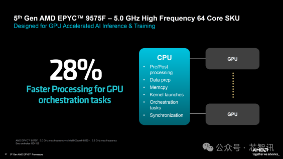 在 AI 性能方面,AMD 还吹捧了一些巨大的收益,主要来自 AVX-512 512b 功能,这些功能确实产生了令人印象深刻的 3.8 倍性能提升。更快的 SKU(如 5 GHz EPYC 9575F)可将 GPU 编排任务的速度提高 28%。