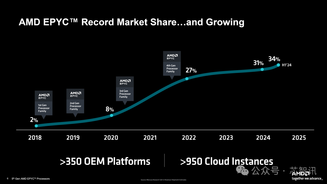 根据AMD的数据显示,自推EPYC CPU推出以来,其在服务器领域的市场份额已经由2018年的2%提升到了34%的市场份额。AMD EPYC平台正在被一些世界上最大的科技公司使用,拥有超过950个云实例和超过350个OEM平台。