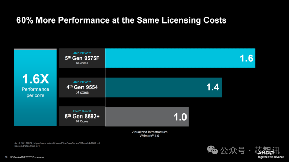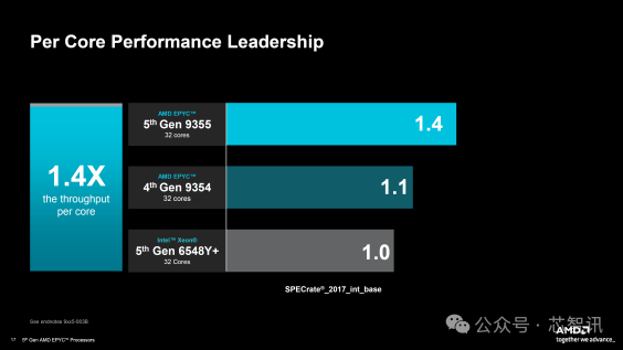 在 SPECrate 2017 INT 基础测试中使用 32 核部件测得的每核性能方面,第 5 代 EPYC CPU 比英特尔第 5 代 Emerald rapids 提高了 40%,比第 4 代 EPYC SKU 提高了 27%。AMD 甚至强调,在虚拟化领域,以相同的许可成本提供强大的性能。