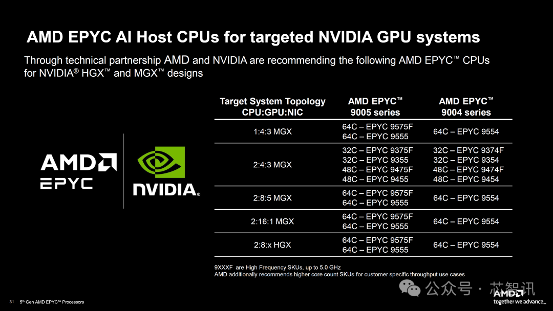 对于 NVIDIA,MGX 解决方案最多可配备 16 个 AI 加速器 (Hopper/Blackwell),而 HGX 配置最多可配备 8 个加速器和最多 2 个 EPYC CPU。AMD和NVIDIA宣布了一项技术合作,推荐了一系列EPYC CPU,范围从32、48和64个核心来看,如下所示: