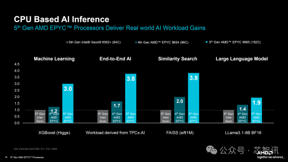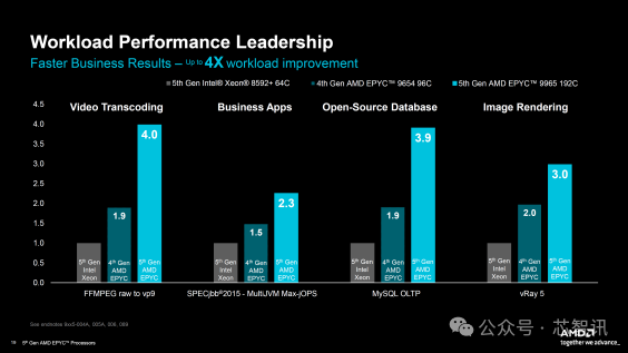 开源HPC性能在密集线性求解器和建模与模拟工作负载中也有了很大的提升,EPYC 9965x提供了比Intel Xeon CPU高出2.1到3.9倍的提升,与第四代EPYC “Genoa” CPU相比提高了2倍以上。