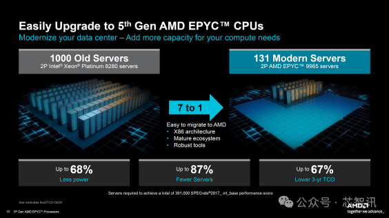 AMD 的 EPYC 平台以提供卓越的性能和超值而闻名,Turin 平台也延续了这一理念。AMD 表示,借助Turin,数据中心公司可以从基于旧 CPU 平台的 1000 台服务器迁移到仅配备 EPYC 9965 CPU 的 131 台现代服务器。这种7对1的方法将允许数据中心公司轻松迁移到最新的芯片,同时保留相同的x86架构集,相同的成熟生态系统和相同的强大工具供他们使用。
