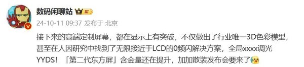 【CNMO科技消息】10月11日,据数码博主@数码闲聊站 爆料,接下来的高端定制屏幕,都在显示上有突破,不仅做出了行业唯一3D色彩模型,甚至找到了无限接近于LCD的0频闪解决方案。
