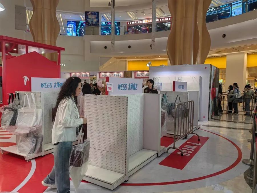 10月10日起,WEGO快闪活动调整为每人每日仅可购买非同款同色的两件痛包,依然供不应求。记者赶到现场时正值清场阶段,“大肠痛包”等热门款的货架已销售一空,不时有工作人员推着几个大纸箱去后台补货。