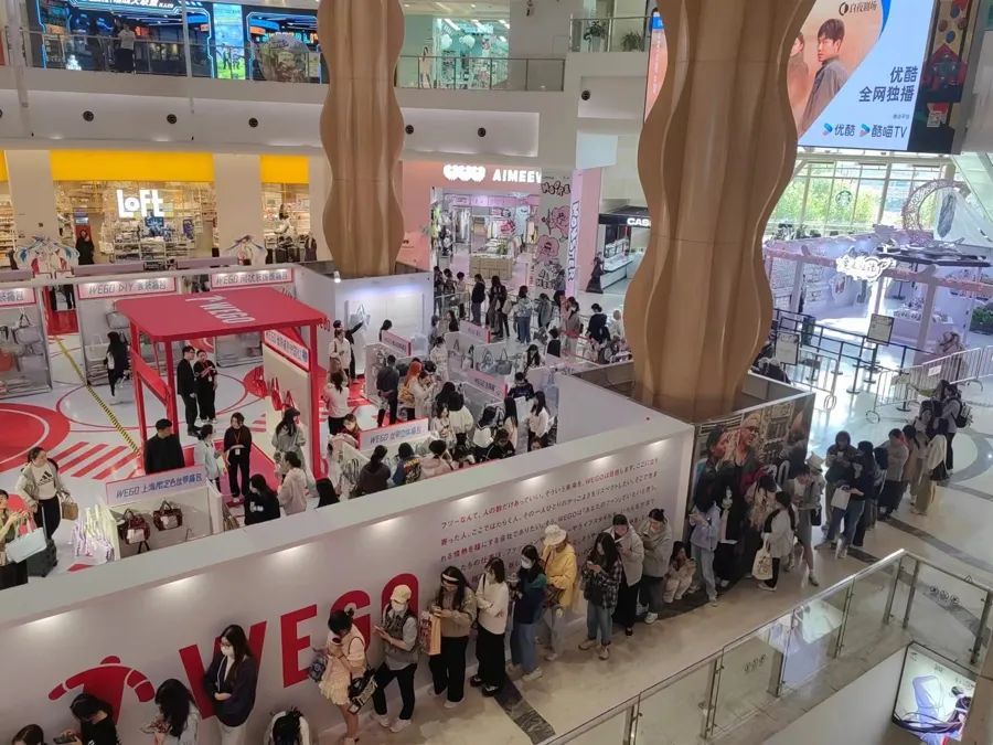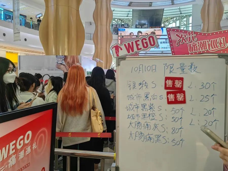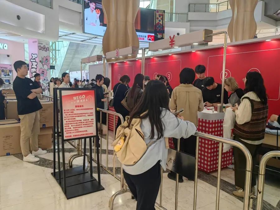 10月9日,顶流痛包品牌WEGO快闪全国首站空降上海静安大悦城,大量粉丝排队抢购。