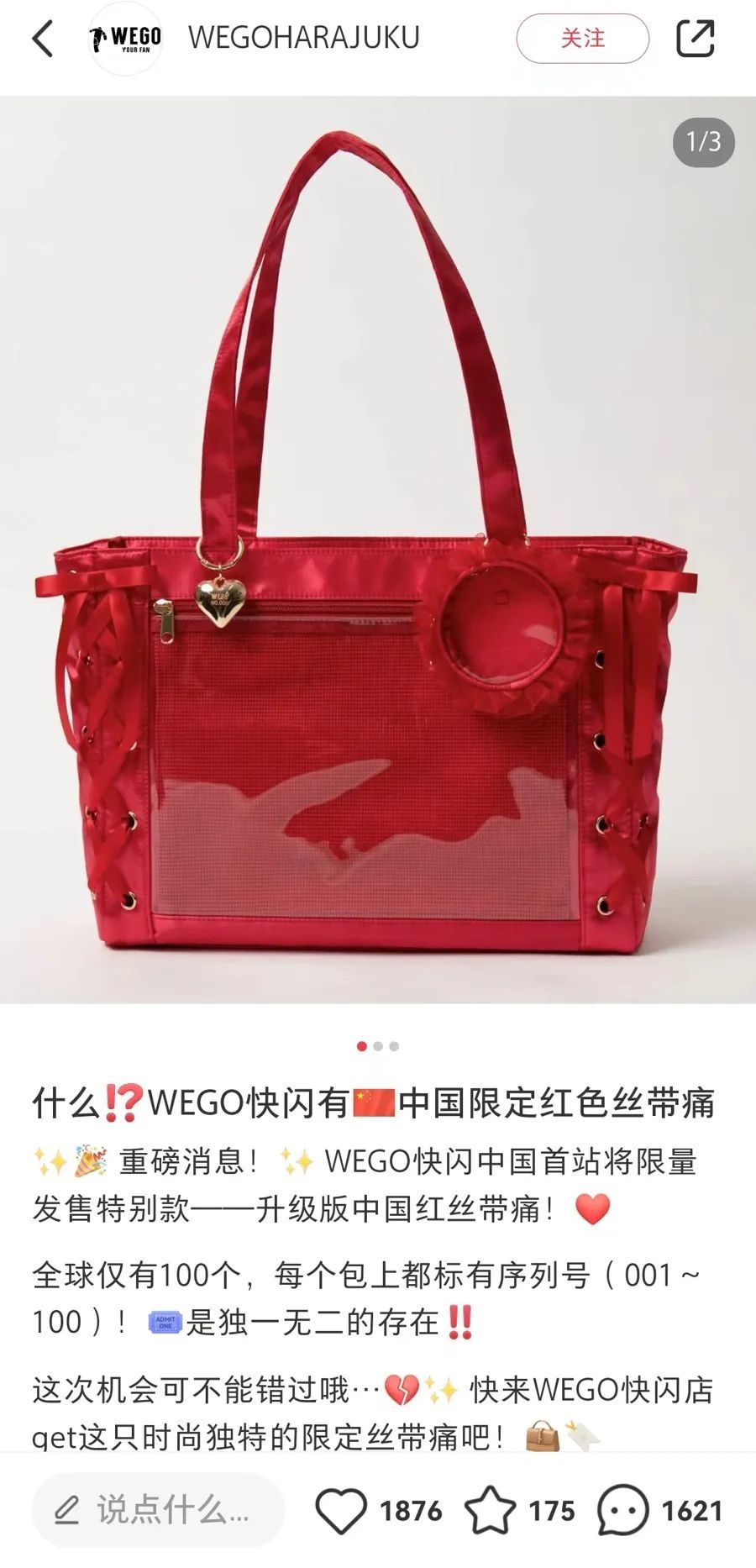 WEGO是日本的平价潮流品牌。今年奥运期间,奥运冠军全红婵展示过WEGO丝带痛包,被粉丝称作“冠军同款”,代购一度断货。此次线下店销售火爆,不少二次元粉丝都不意外。