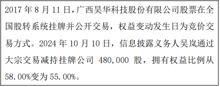 挖贝网10月11日,昊华股份(872107)发公告称,2024年10月10日,信息披露义务人吴岚通过大宗交易减持挂牌公司480,000股,拥有权益比例从58.00%变为55.00%。