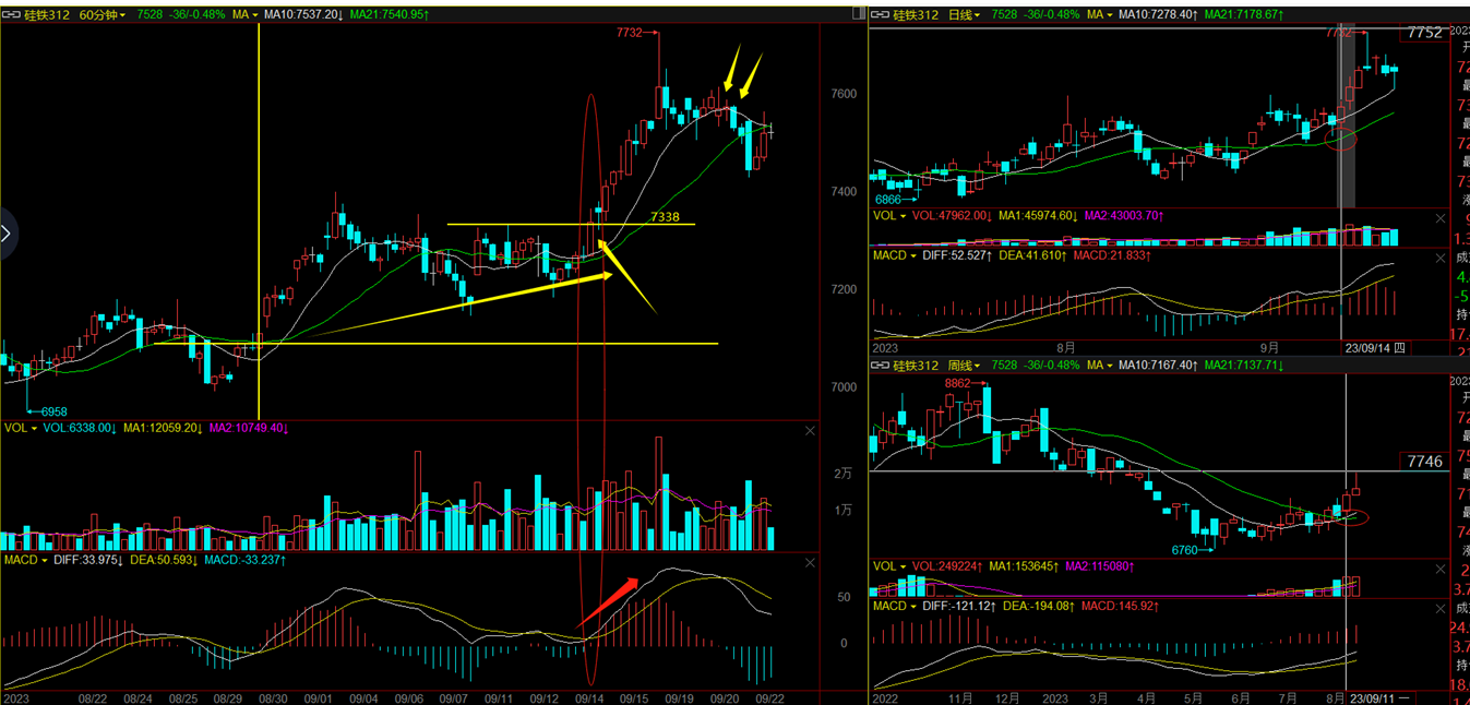 以硅铁为例,我们寻找多周期同向的机会。回顾今年的有色金属行情,尤其是沪锡的行情,这些都是我们实际操作过的案例。例如,在7月份文华商品指数还在185点时,我们已经开始减少长线多单。