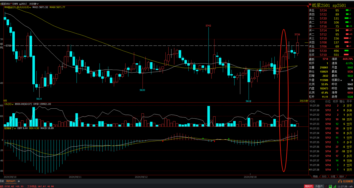 以最近的纸浆行情为例,我的开仓点就是基于这种分析。我们在15分钟周期内找到了大约100个点的利润空间。在寻找进场点时,不仅要看信号,还要结合均线和其他因素综合判断。一旦这样的点出现,你就要敢于进场。例如,我们的成本价大约在5710点左右,而本周的最高点达到了5818点,即使在昨晚的回调之后,价格仍然高于我们的开仓点。当然,我们已经根据开仓和止盈的条件进行了操作,这些条件可以供大家参考。