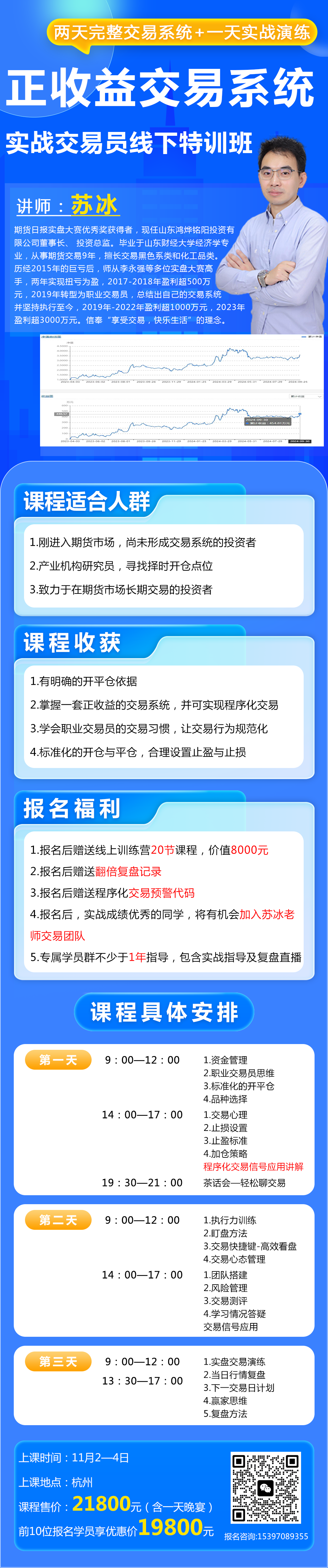 11月2日至4日,苏冰老师的“期货实战交易线下特训班”将在杭州开课,两天理论+两天实战+1年指导,感兴趣的可以咨询15397089355(同微)