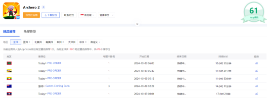 虽然《弓箭传说2》是在9月底被发现,但根据三方平台数据显示,游戏在2024年6月以《Destiny's Arrow》的名字在部分地区进行了上线,9月底则是在测试地区之外开启了预约。除了参与者对产品的关注外,AppStore也给足了面子。点点数据显示,截至10月9日,《弓箭传说2》在全球170个地区被精品推荐中,共476个推荐位。