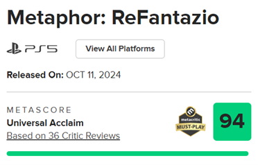 在10月8日发布的海外评论汇总网站“Metacritic”上,《暗喻幻想:ReFantazio》获得了高分:Xbox版92分,PlayStation®5版94分(2024年发布作品中最高评分),Windows/Steam版91分(截至10月11日)。