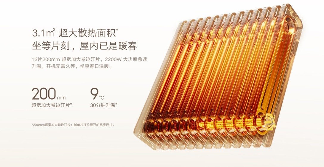 米家石墨烯油汀取暖器拥有 3.1m2 超大散热面积,同时搭载了 13 片 200mm 超宽加大卷边汀片和 2200W 大功率,无需漫长等待,急速升温。