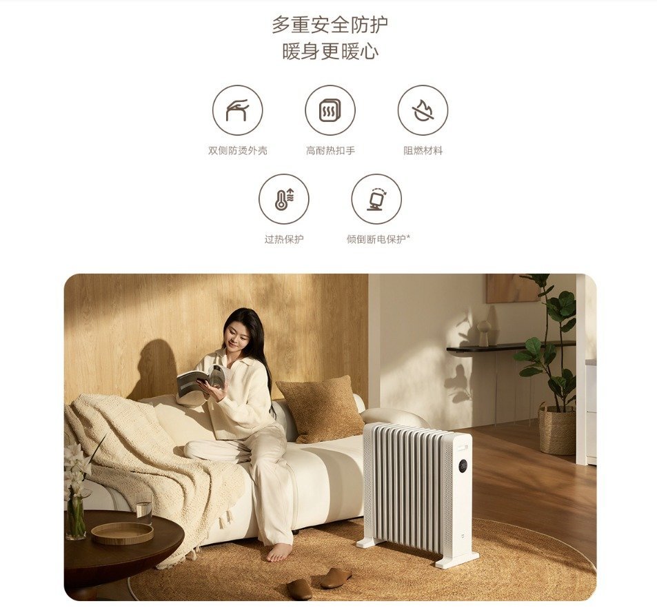 其他方面,米家石墨烯油汀取暖器支持澎湃智联,通过小爱同学和米家 APP 即可远程控制。它还搭载 LED 显示屏,操作清晰明了,还有双侧防烫手外壳设计和过热保护等等。