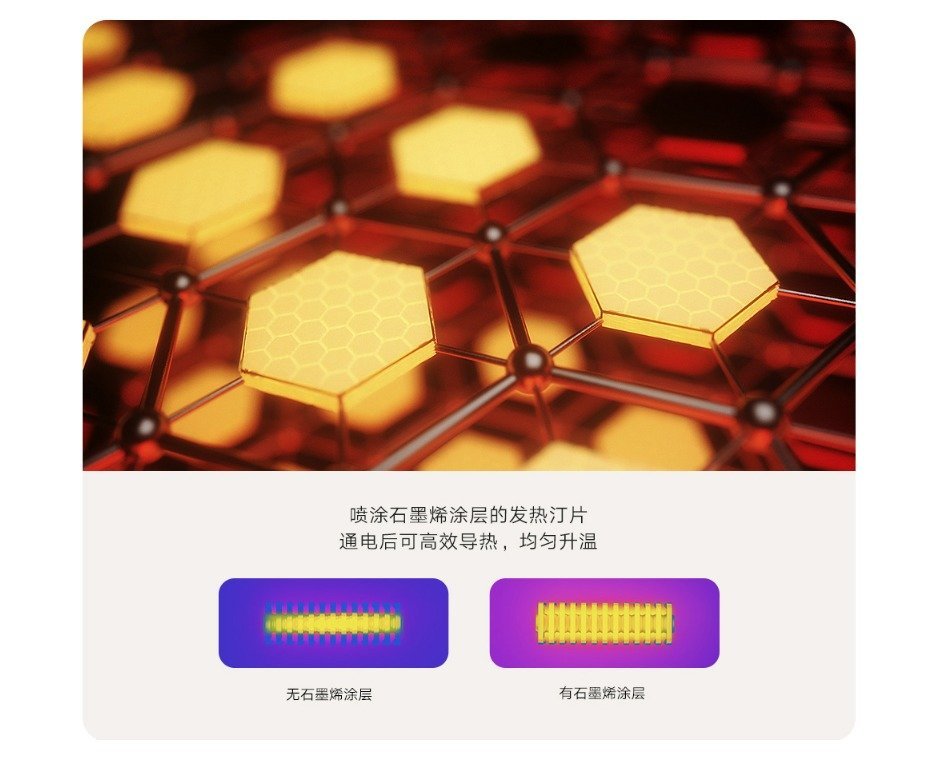 米家石墨烯油汀取暖器的发热汀片表面喷涂有石墨烯材料,发热更均匀,实现了高效导热。同时它在导热过程中,能释放出接近人体波长的远红外光波,让人能享受到“日光浴”的体感。