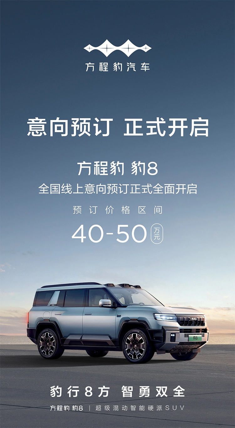 10月12日消息,今天比亚迪正式宣布,即日起开启方程豹豹8的全国线上意向预订,并公布了预订价格区间,在40-50万元。
