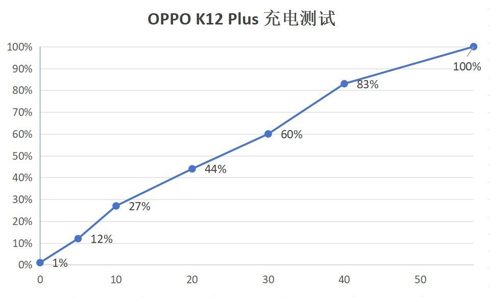 OPPO K12 Plus 的充电表现也很亮眼,它搭载同档领先的 80W 超级闪充。经实测从 0% 开始,10 分钟就充入 27% 电量,半小时充入 60 %,最后充至 100% 电量用时 57 分钟。像这样一台有 6400mAh 电池的手机来说,充电回血用时不到不到一个小时,表现也相当不错。