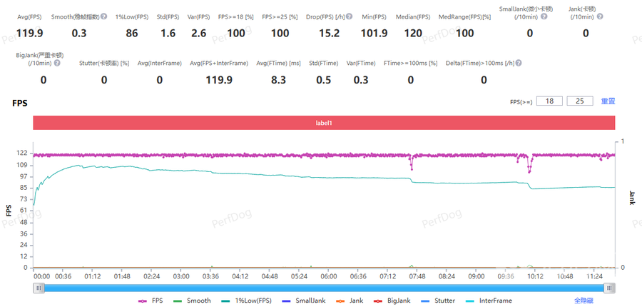 游戏方面,OPPO K12 Plus以运行《王者荣耀》,选择极高画质、超高分辨率,画面总质量为高清模式,经过PerfDog的测试,平均帧率达到了119.9FPS,在游戏过程中,小范围的团战依然能保持满帧运行的状态,当遇到全员参与的10人团战时,游戏帧率会有一定的波动,但很快会再次平稳在120FPS的状态。在游戏过程中,这样的帧率波动对于体验的影响并不明显。