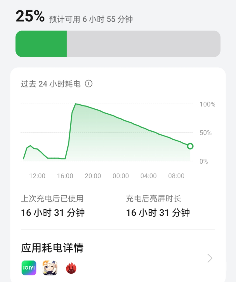 OPPO K12 Plus的DOU高达2.2天,我们也对电池进行了测试,当手机满电状态下,将屏幕亮度设定为50%,音量设定为20%,播放1080P视频,手机连续播放16小时30分钟,电量依然剩余25%,系统显示手机仍然可用6小时55分钟,续航表现十分的出色。