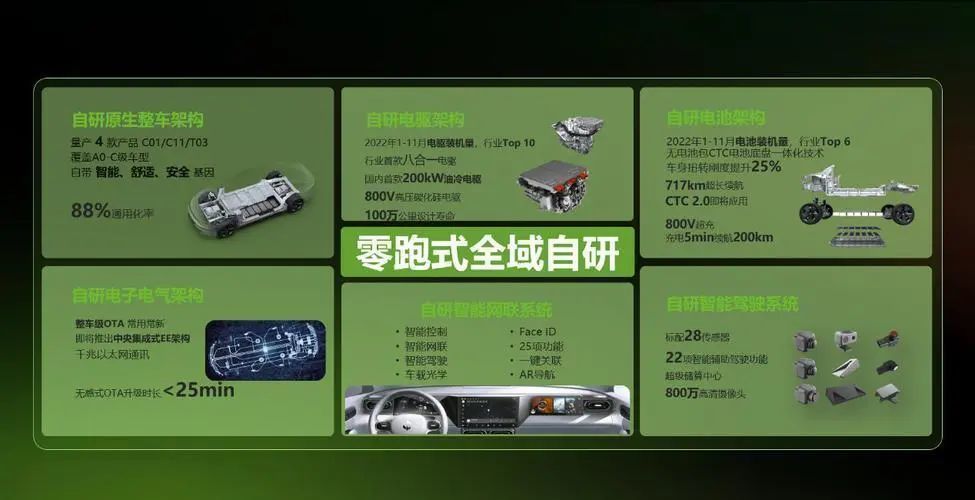 “全域自研”模式先后支持零跑汽车推出多项领先技术,包括八合一电驱、CTC电池底盘一体化技术、智能驾驶芯片“凌芯01”、“四域合一”中央集成式电子电气架构等。这些成果不仅为公司构建了技术护城河,还加速了平台化产品的落地。