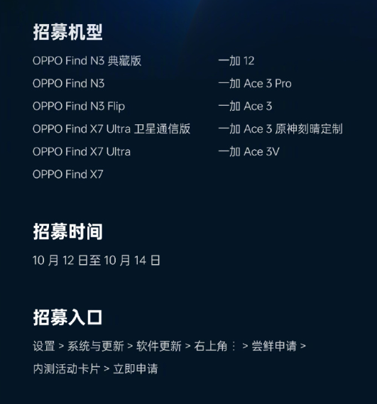 目前,OPPO Find N3 典藏版、OPPO Find N3、OPPO Find N3 Flip、OPPO Find X7 Ultra 卫星通信版、OPPO Find X7 Ultra、OPPO Find X7、一加12、一加Ace 3 Pro、一加Ace 3、一加Ace 3原神刻晴定制版、一加Ace 3V等十一款机型可以申请。