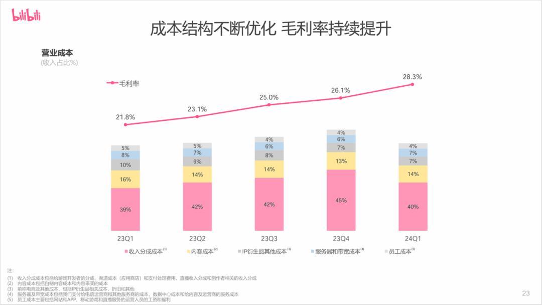 2023年第一季度B站服务器及带宽成本为3.8亿元。