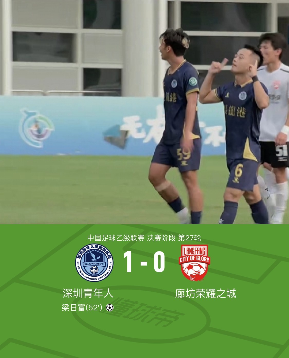 在中国足球乙级联赛决赛阶段的较量中,深圳青年人坐镇主场迎战廊坊荣耀之城。比赛中,深圳青年人的梁日富表现出色,成功攻入一球。凭借这一关键进球,深圳青年人以1-0小胜对手,取得了比赛的胜利。