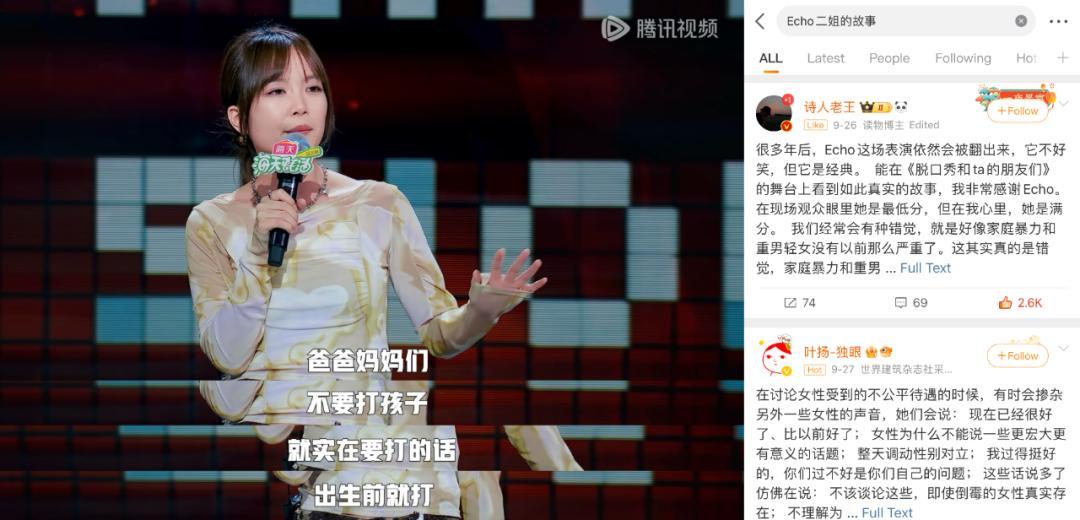 上个月院线电影《出走的决心》拿到了豆瓣8.9分,而在最近《脱口秀和Ta的朋友们》第六期的综艺舞台上,女演员Echo讲述二姐从重男轻女家庭出走的脱口秀只获得了全场最低的105票。