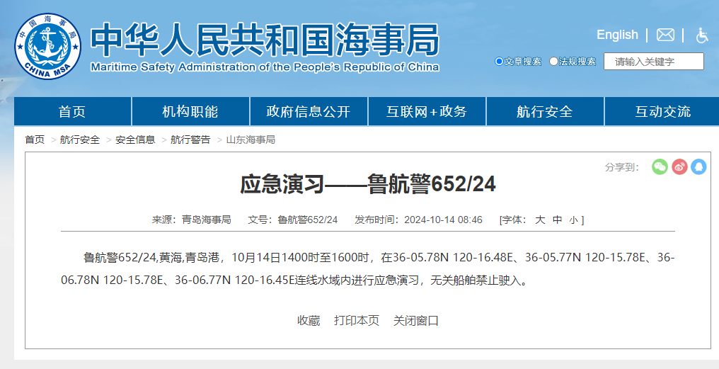 据中国海事局官网:鲁航警652/24,黄海,青岛港,10月14日14:00时至16:00时,在36-05.78N 120-16.48E、36-05.77N 120-15.78E、36-06.78N 120-15.78E、36-06.77N 120-16.45E连线水域内进行应急演习,无关船舶禁止驶入。