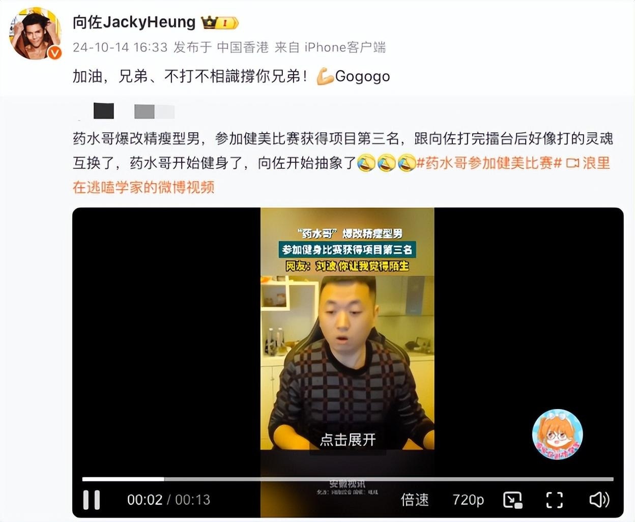 10月14日,向佐发文:“加油兄弟!不打不相识,撑你兄弟!Gogogo。”