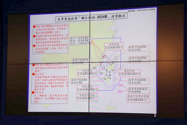 大陆解放军14日宣布对台军演,台湾军方侦获125架次陆机,其中90架次进入应变区。(照:截自台湾军方记者会画面)