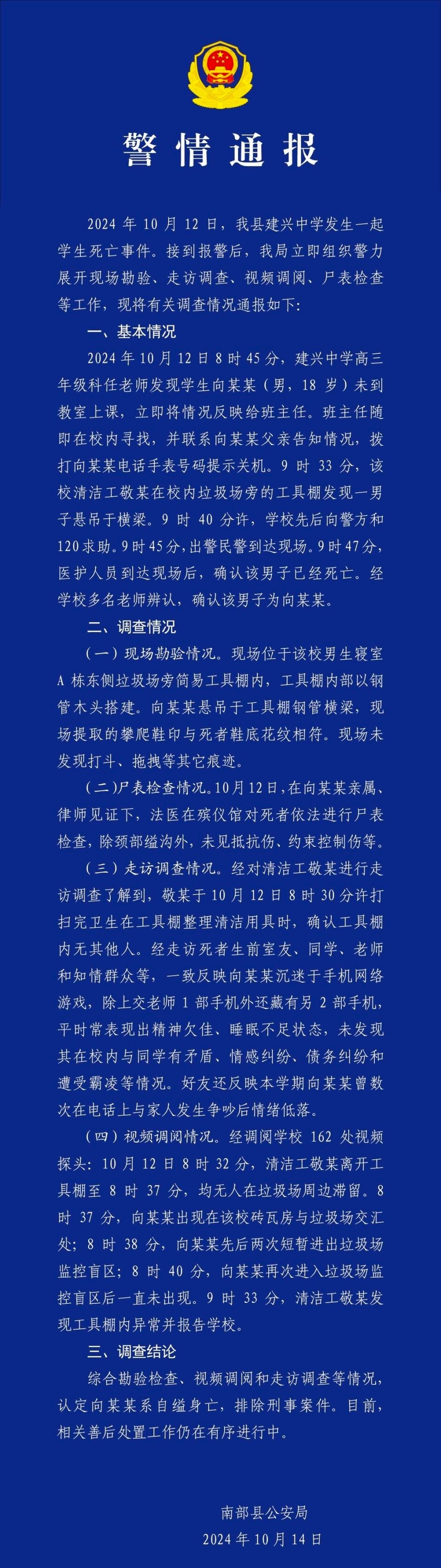 10月14日,四川南部县公安局发布警情通报:2024年10月12日,我县建兴中学发生一起学生死亡事件。综合勘验检查、视频调阅和走访调查等情况,认定学生向某某系自缢身亡,排除刑事案件。目前,相关善后处置工作仍在有序进行中。