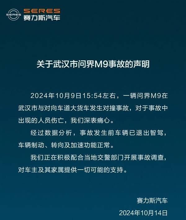 2024年10月9日15:54左右,一辆问界M9在武汉市与对向车道大货车发生对撞事故,对于事故中出现的人员伤亡,我们深表痛心。