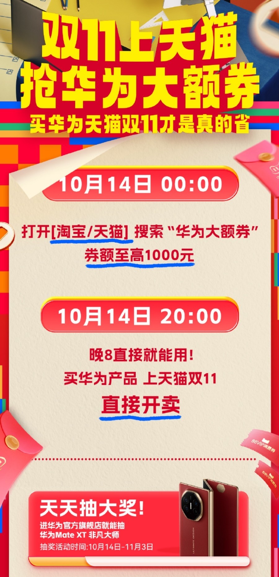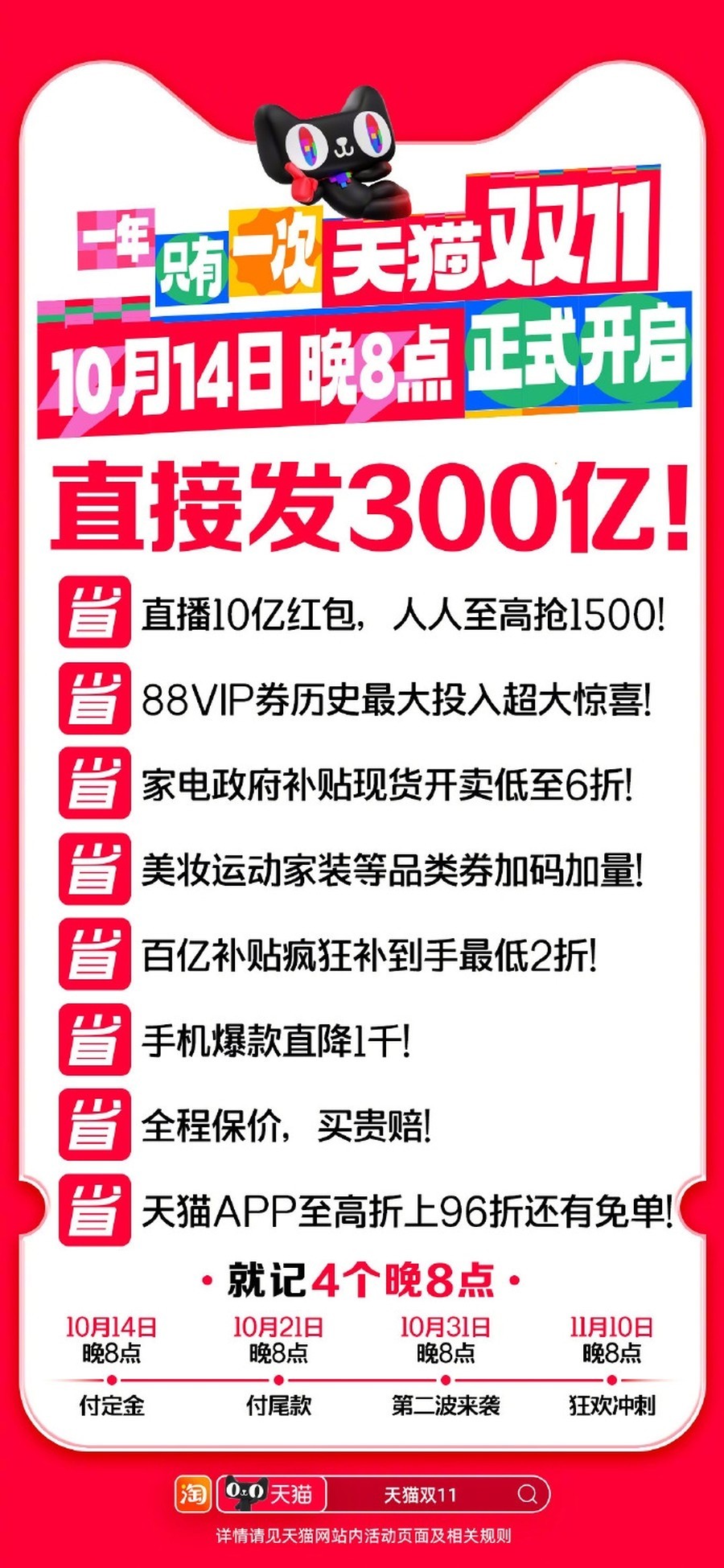 2024年天猫双11将于今晚8点正式启动,预计成为历年来补贴力度最大、红包数量最多的一届。天猫今年额外投入了300亿消费券和红包,88VIP用户还将迎来全新玩法,只需在淘宝搜索“88VIP”,即可享受惊喜福利。而且此次双11,政府补贴首次与天猫双11优惠叠加,8大行业类目的优惠券以及华为等单品大额券都可于下午2点直接领取。此外,淘宝百亿补贴追加了750元的“超级大额红包”,每人每天最多可领1500元。同时,百大直播间将在今晚8点同步开启,派发10亿红包。