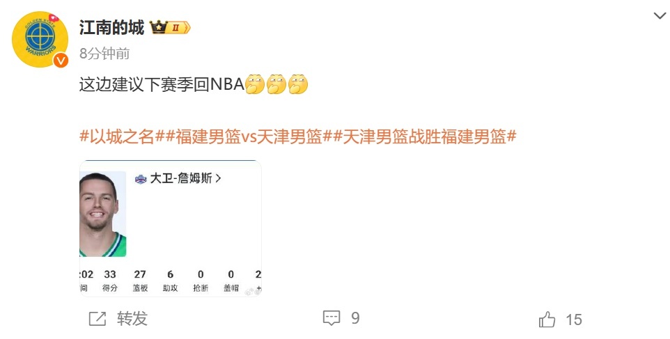 知名体育博主“江南的城”赛后晒出詹姆斯的数据,并配文写道:这边建议下赛季回NBA。