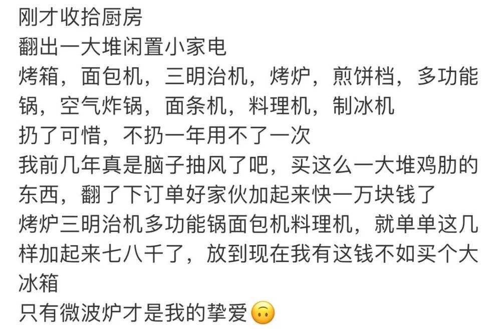 风向变得太快了,前几年还在狂推厨房小家电的家居博主,已经开始做“厨房鸡肋电器排行”了: