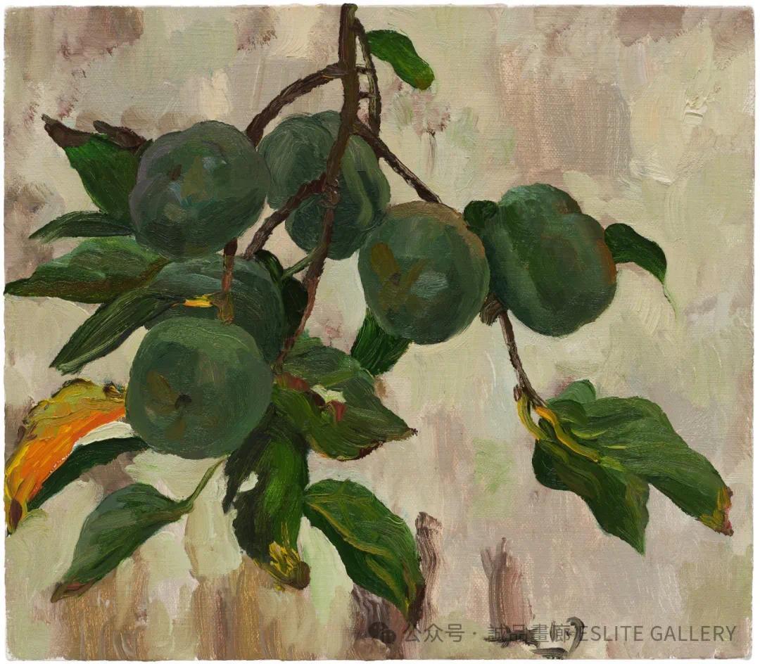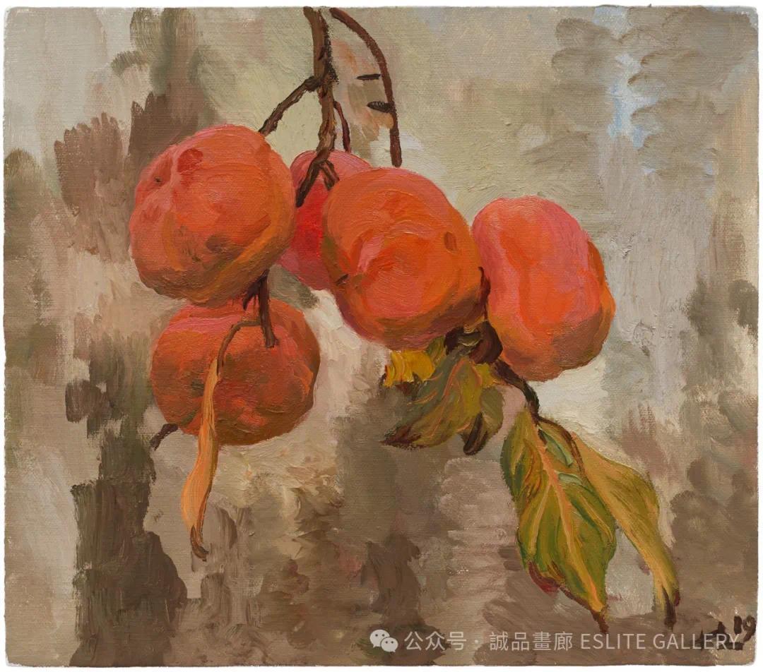 ▲ 刘小东,仲夏到深秋 剩下五个柿子,2019,油彩/亚麻布,35 x 40 cm