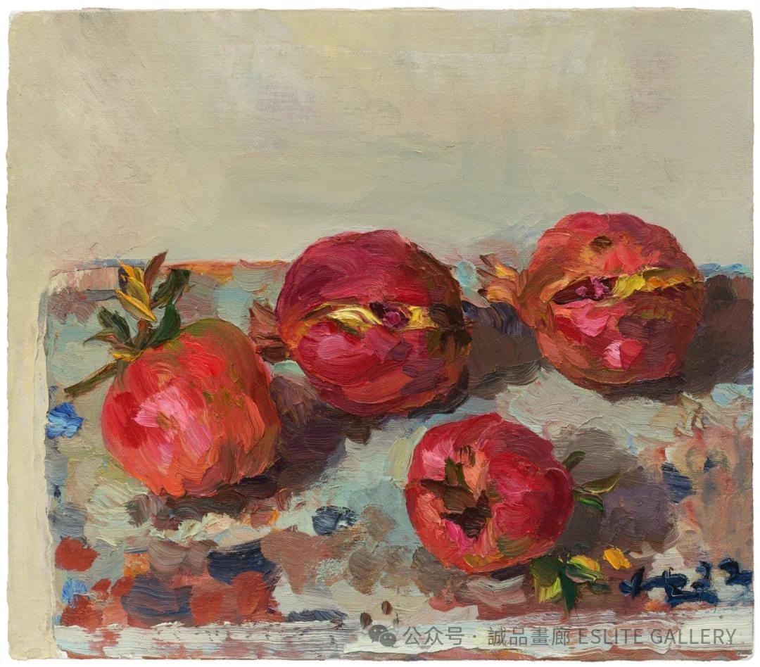 ▲ 刘小东,四个石榴,2022,油彩/亚麻布,35 x 40 cm
