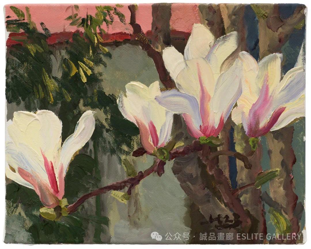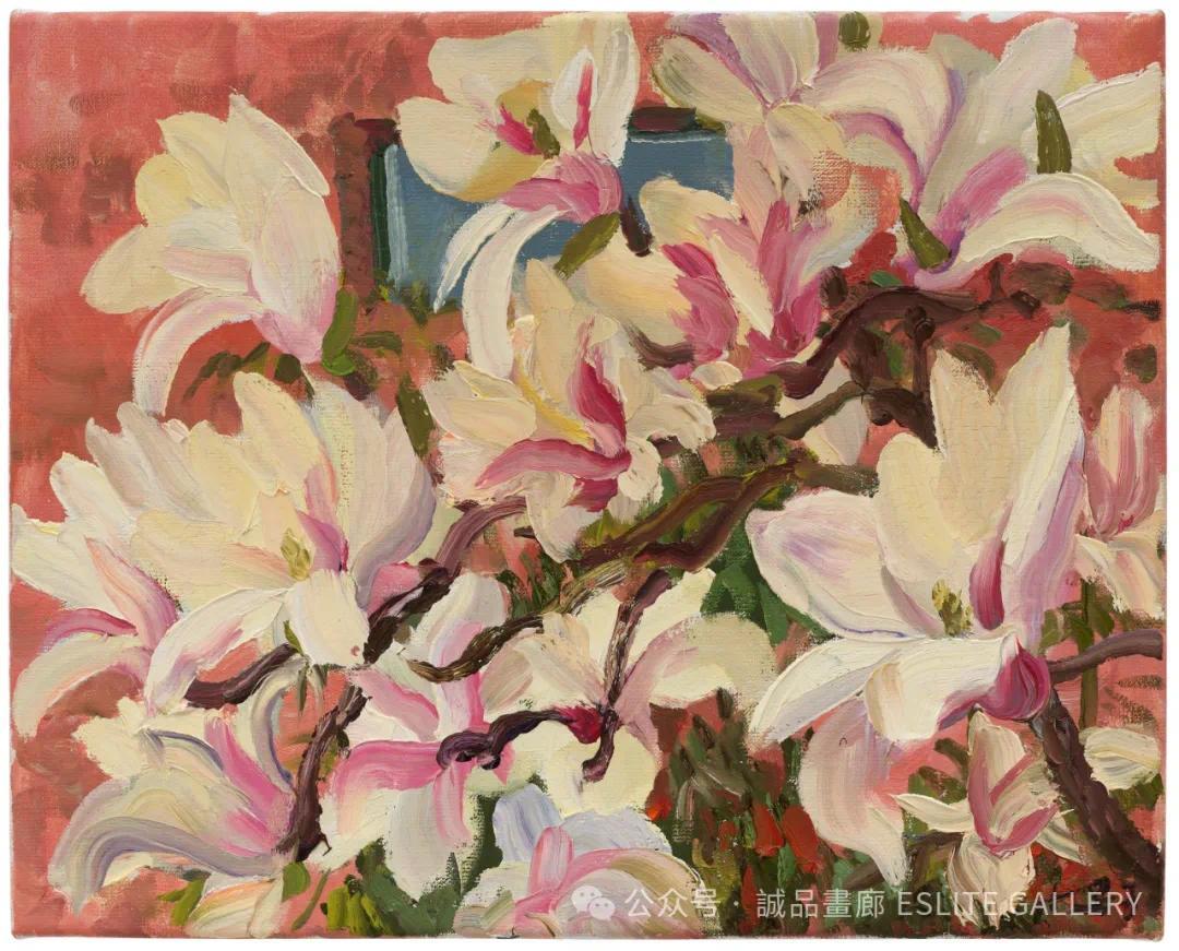 ▲ 刘小东,怒放玉兰,2023,油彩/亚麻布,33 x 41 cm