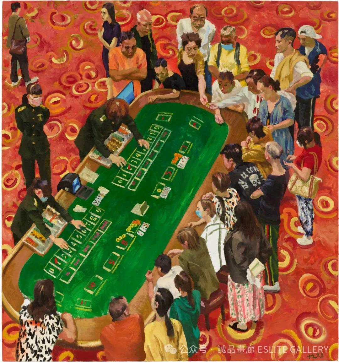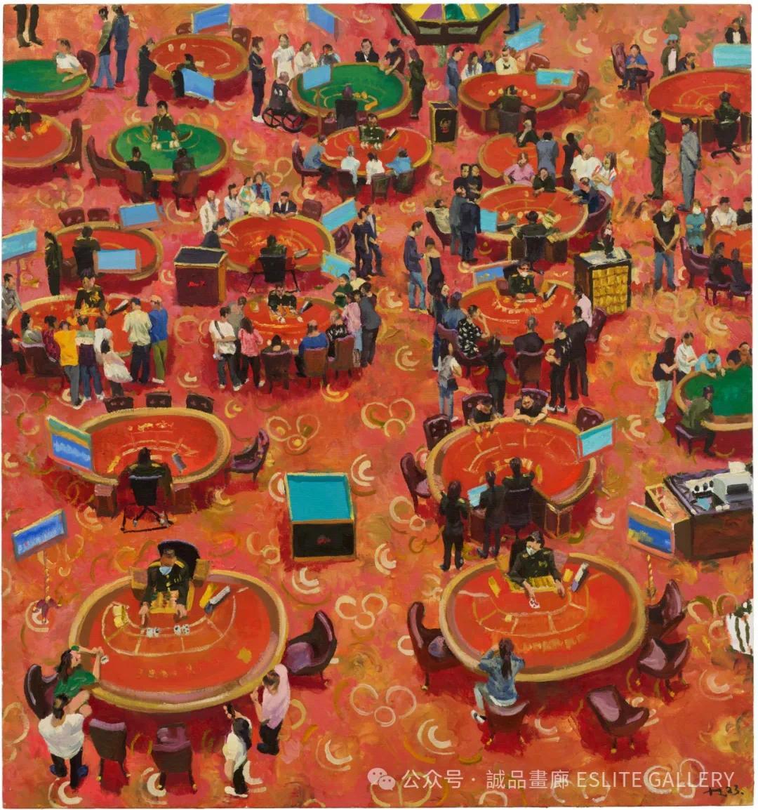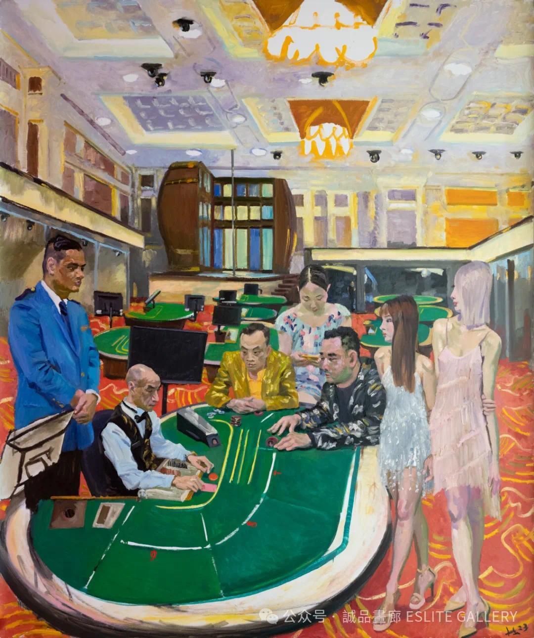 澳门的文化背景独特,它既有深厚的中华文化底蕴,又受到了数百年葡萄牙殖民的影响。中西融合的建筑、语言和风俗,使澳门成为一座独一无二的城市。然而,澳门的繁荣背后,也隐藏着许多社会问题。刘小东并未回避这些现实,他通过对赌场中普通人的描绘,揭示了人在物质诱惑下的迷失与挣扎。那些在赌桌前沉迷的人们,或许是为了改变命运,或许只是为了寻求刺激,但他们的孤独与无奈,在画面中显露无遗。