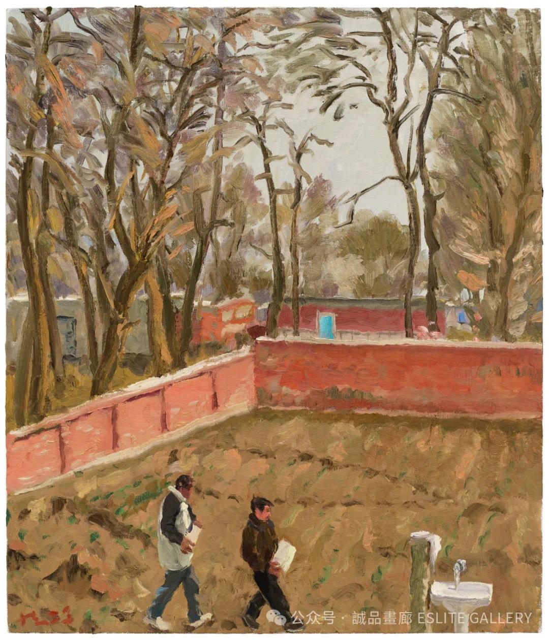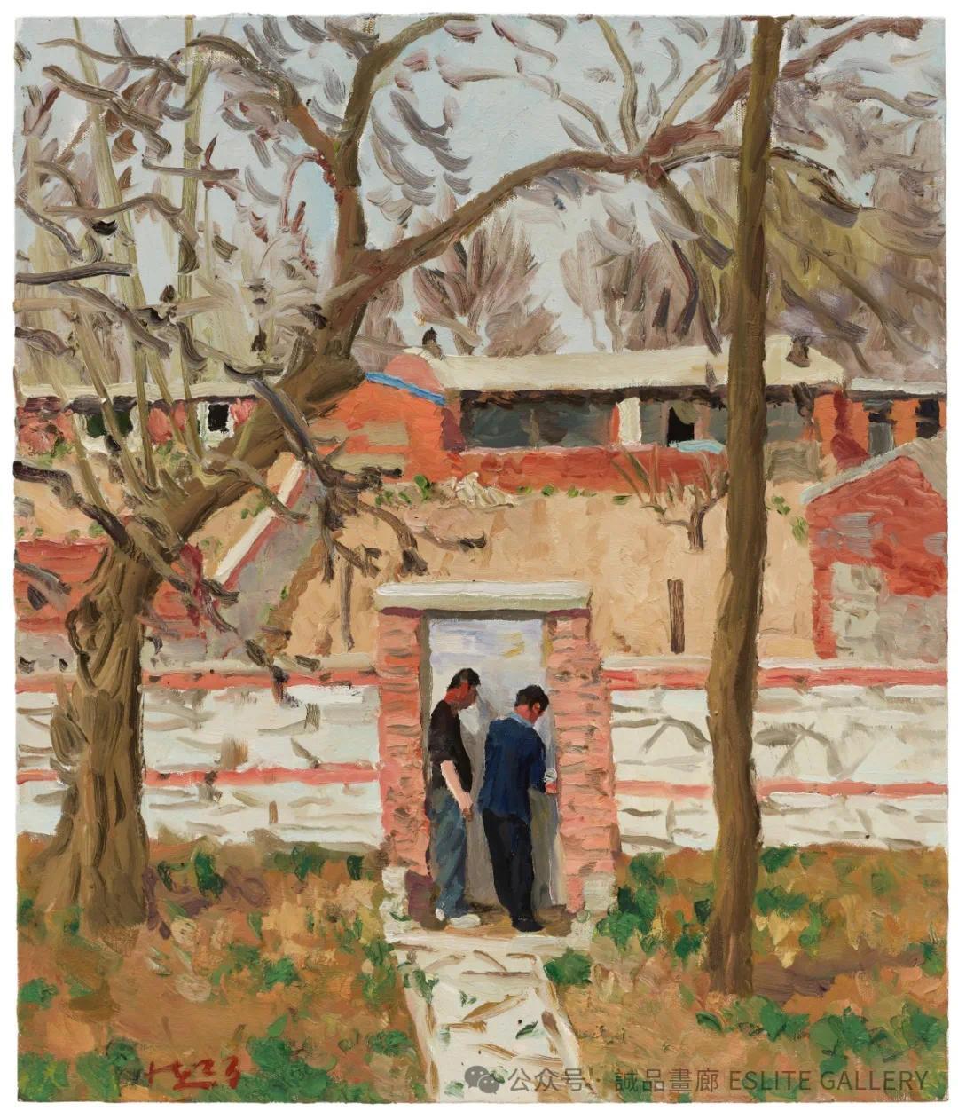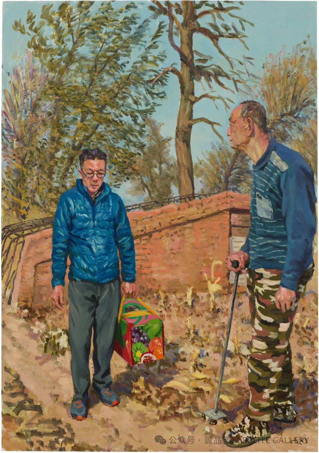 辽宁省金城镇,这片位于中国东北的黑土地,孕育了他对生活最初的感知。在“东北老家”系列中,他回到了故乡,描绘了家人、友人和乡村的日常生活。作品《送礼的路上》中,村民踏着泥泞的道路,手中捧着朴实的礼物,那是东北人特有的淳朴与热情。《哥哥修锁》和《哥哥搬石头》展现了乡村生活的劳作场景,粗糙的双手和汗水浸透的衣衫,传递出劳动的坚韧与尊严。