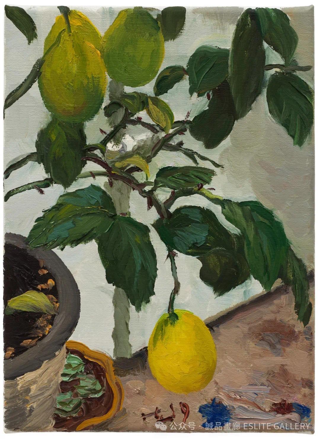 ▲ 刘小东,熟了一个小柠檬,2019,油彩/亚麻布,33 x 24 cm