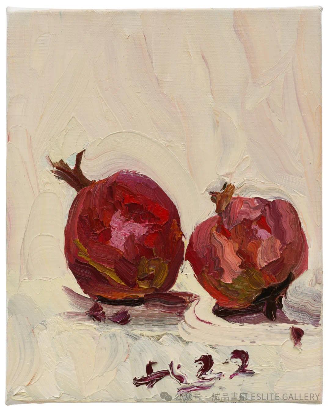 ▲ 刘小东,两个石榴,2022,油彩/亚麻布,30 x 24 cm