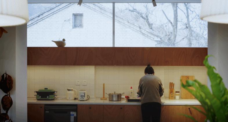 跳墙之家的厨房也设计了一个向东的条形开窗,当人站在比厨房高一点的空间里时,就可以看见远山