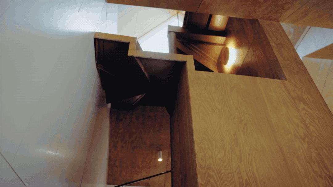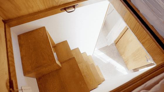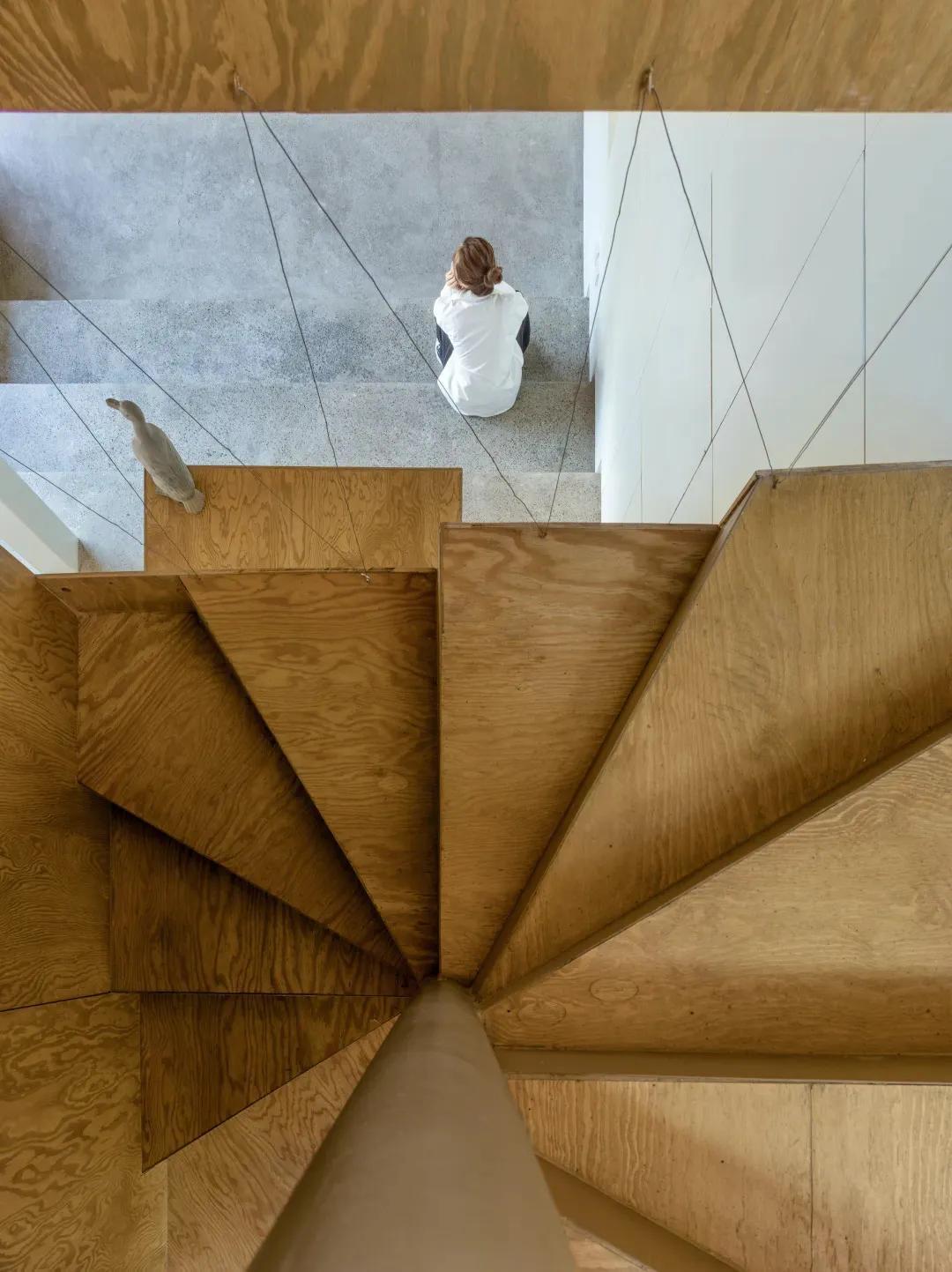 成直在小户型的山雀之家塞进两条独立的楼梯,公共与私密空间完全分离,其中大旋转楼梯被藏在厨房后,内置储物空间