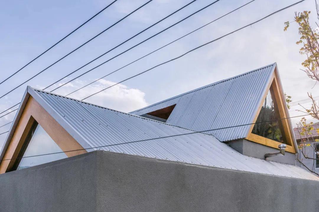 拆除老屋后,我在原来的位置搭建了一个体量完全一致的新房子,用钢结构轻建造的方式,将整个建筑统一在一起。两个坡屋顶互相搭接,坡面向场地内部,削弱对邻居的影响,在高处形成一个三角形的空间。