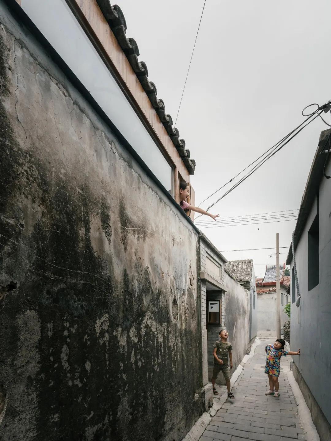 过道之家原本破败的杂货屋,改造成了尖屋顶的阁楼。靠近胡同一侧凿开了一扇长条窗,搭上木楼梯之后,小朋友很喜欢在这里攀爬、玩耍