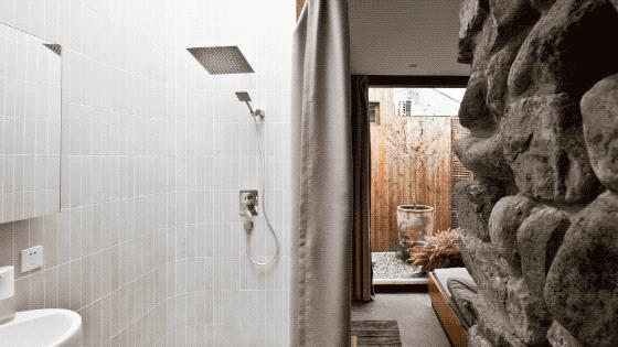 过道之家拥有玻璃顶的浴室,把自然光和天空最大化的引入房间,晚上抬头就能看到星星