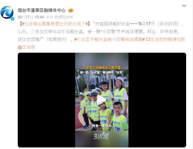 比发朋友圈更社死的,是烟台组织的“小交警”喊话,一群小朋友大声喊“大姐姐请戴好头盔”,真建议全国推广。